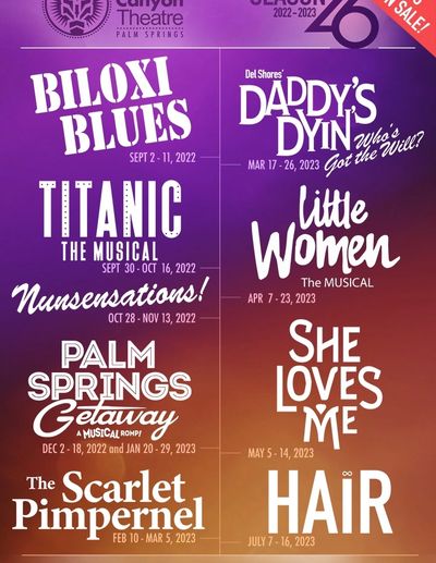Broadway and Classic plays are announced for Palm Canyon Theatre’s 26th season. The Palm Canyon Theatre is the city’s oldest source of live theatrical entertainment running Broadway favorites and classic stage productions from September to July. Season packages are now available through the box office by calling 760-323-5123.
