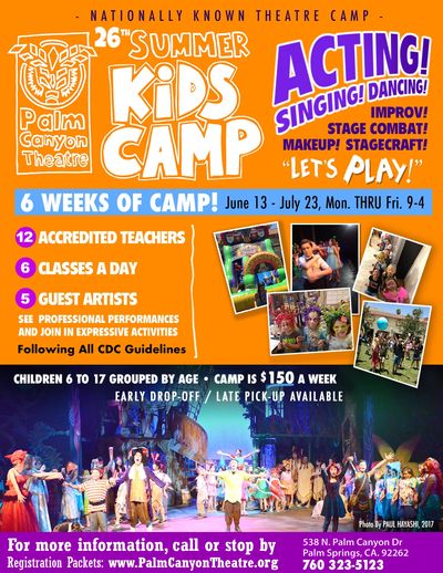 For more information or to register for Summer Kids Camp, call the Palm Canyon Theatre Box Office at 760-323-5123 or download the registration information online at: PalmCanyonTheatre.org. Also find out more about PCT at: https://www.facebook.com/ThePalmCanyonTheatre. Palm Canyon Theatre is located at 538 North Palm Canyon Drive, at the corner of Alejo Road and Palm Canyon Drive.
