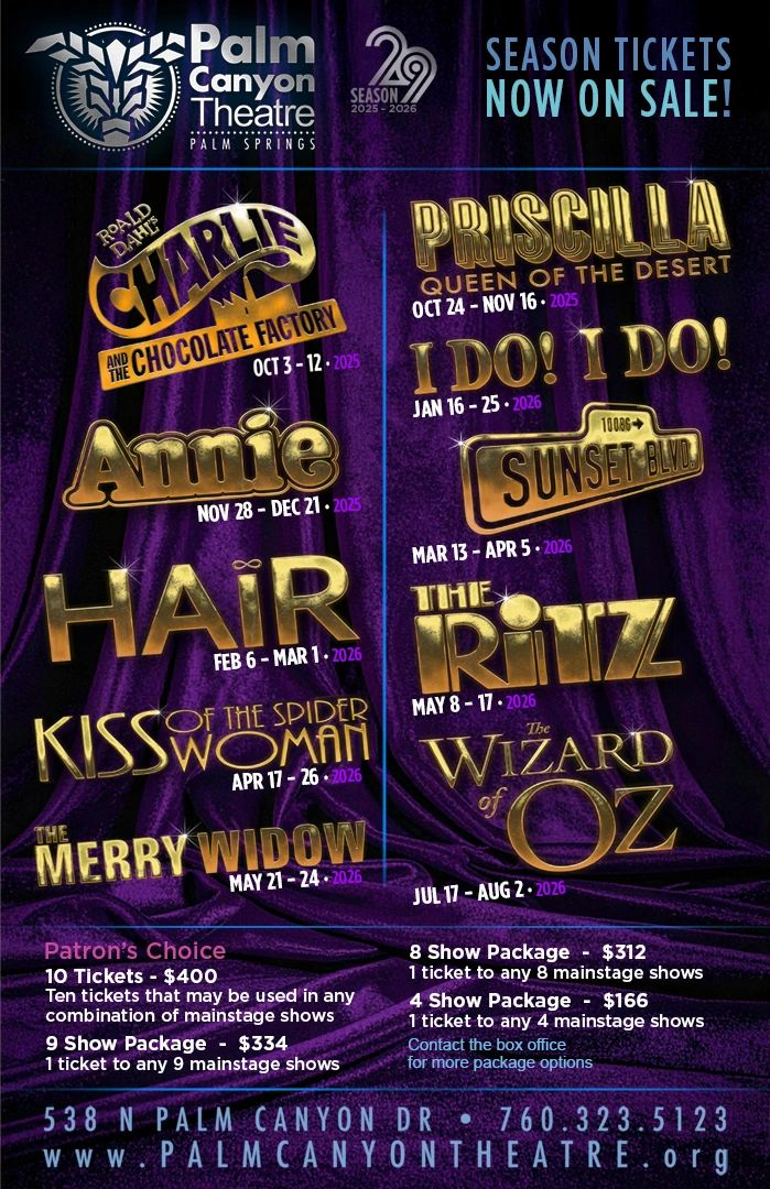 Season Subscriptions are available here or by calling the Box Office. 760-323-5123 Tues - Fri 10am-4pm